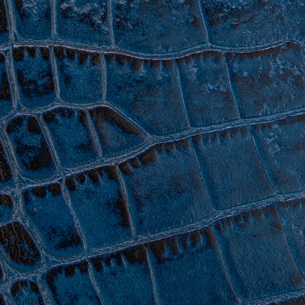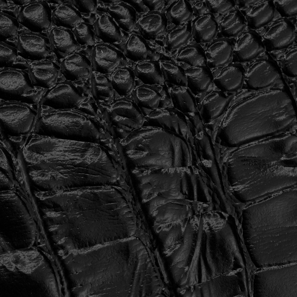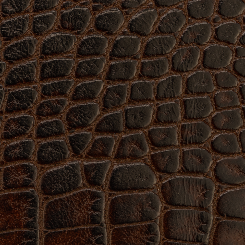 Using natural cowhide, a croco belly print is embossed giving a semi firm temper